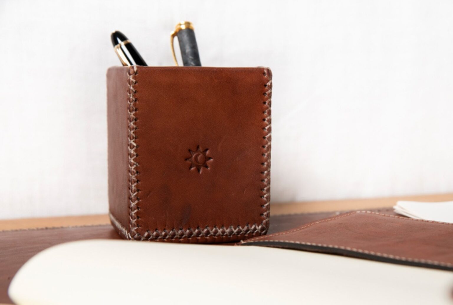 Matching the tray, we also offer our the leather pencil and pen holder; a leather item that is completely different from anything else you might find, thanks to the artisanal character that defines Sol&Luna.