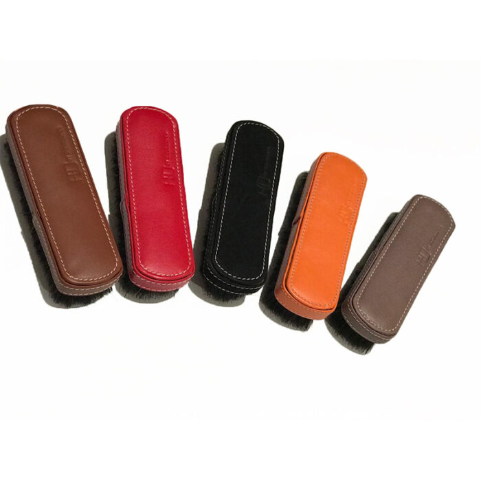 Descripción: Cepillo para zapatos con base de madera y forrado en cuero. Se presenta en funda de felpa y caja regalo. Disponible en marrón, negro, rojo, naranja y topo.