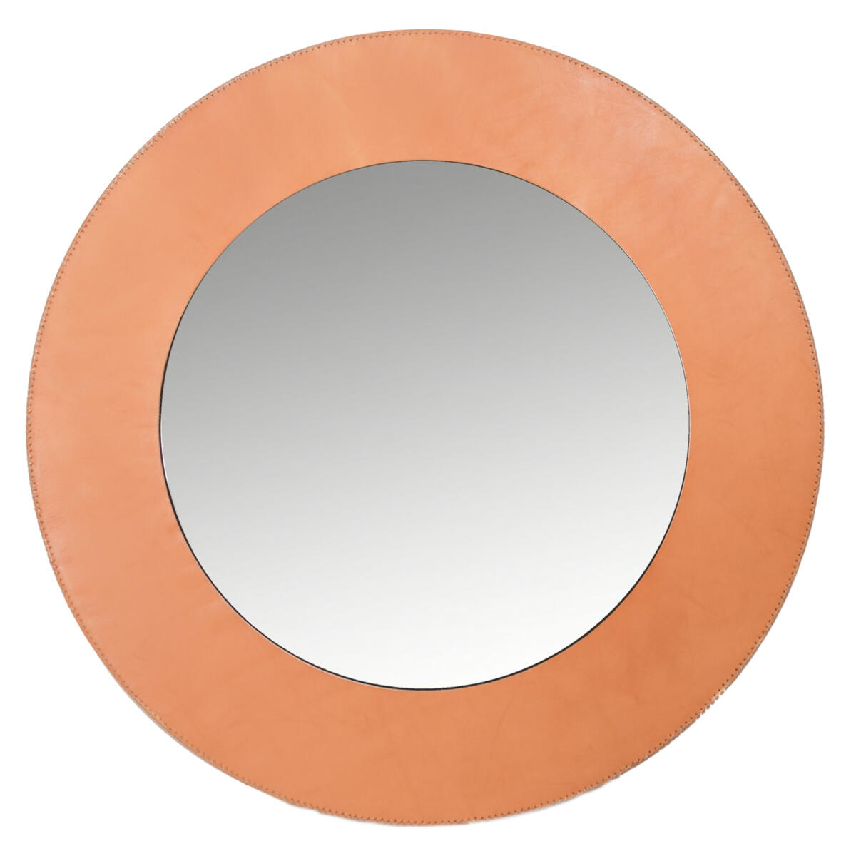 Descripción: Espejo grande redondo forrado en cuero. Disponible en cuero natural, marrón, negro, rojo y naranja. También disponible Espejo pequeño redondo.