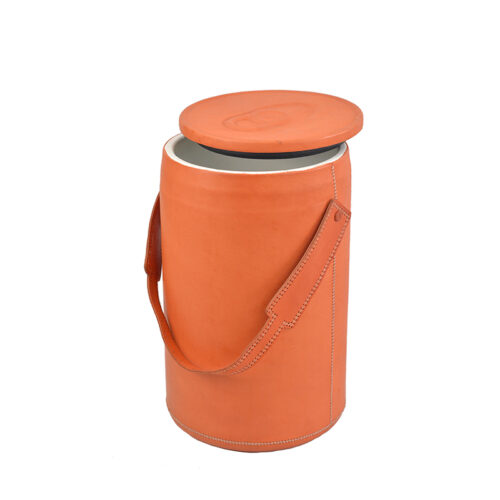 Description: Large Can Cooler covered in leather. Available in natural, brown, black, red and orange leather. Also available in smaler size Can Cooler