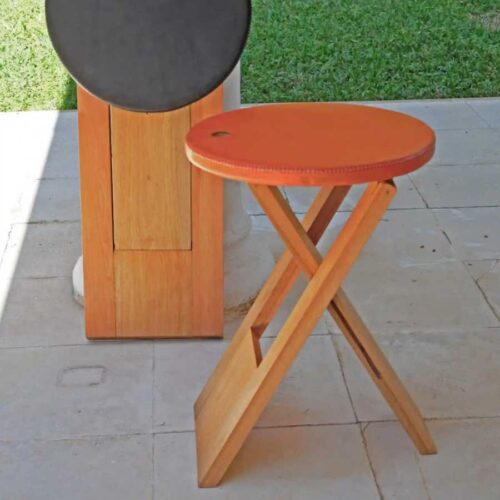Description: Mesa auxiliar cuadrada con con estructura de hierro y tapa de cuero. Disponible en cuero natural, marrón, negro, rojo y naranja.