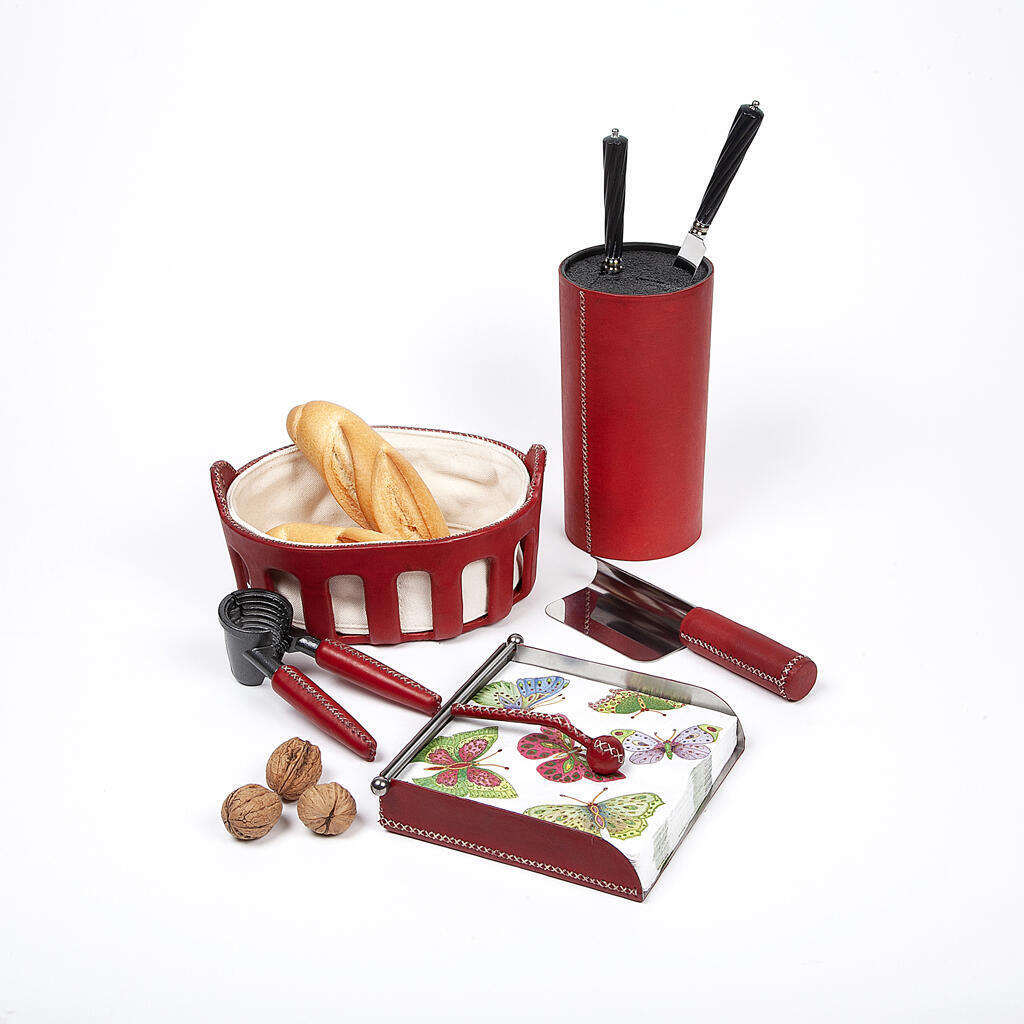 Description  Breadbasket  covered in leather with a fabric cover. Available in natural, brown, black, red and orange leather.