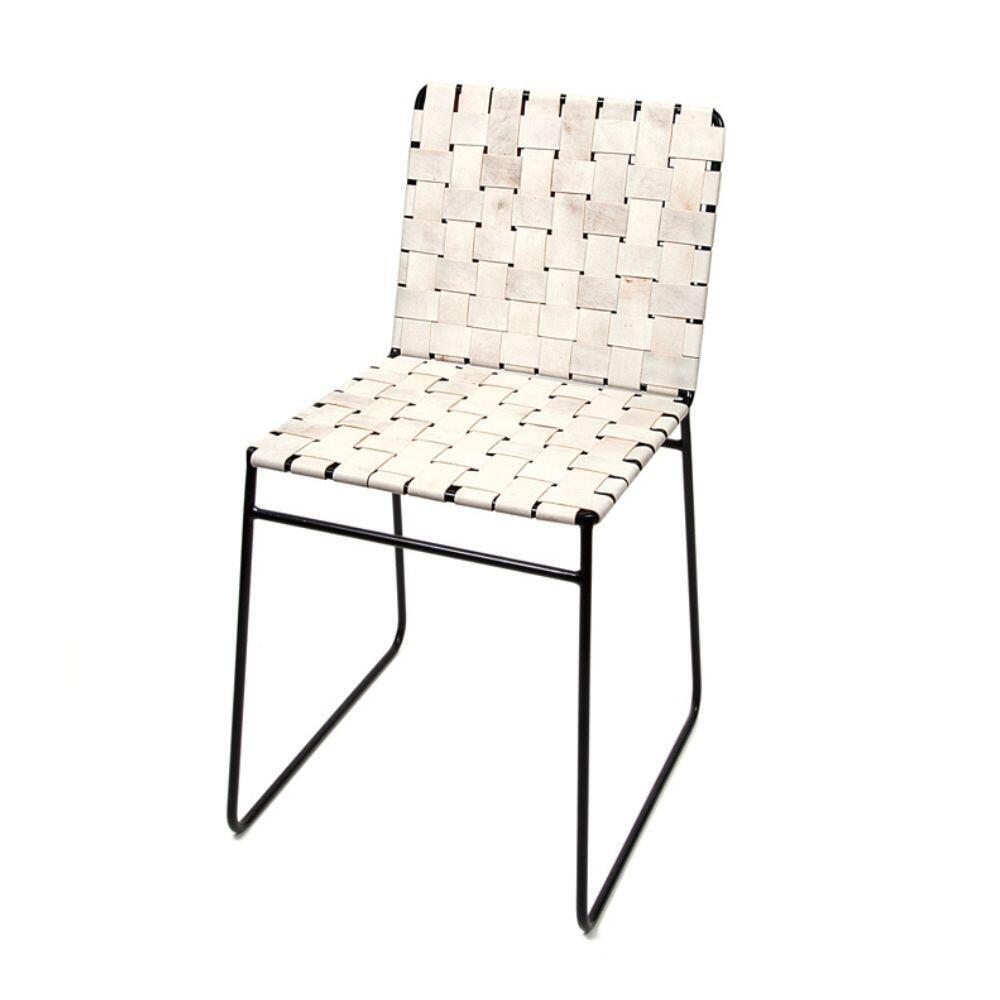 Description: Chair with iron base, seat and backrest in woven leather. Available in natural, brown, black, red, orange and new Off -white raw leather. Also available Woven stool (PN9091) and Woven Stool (PN9091F)