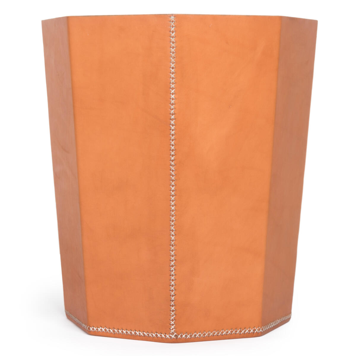 Descripción: Papelera octogonal forrada de cuero e interior pintado en color madera. Disponible en cuero natural, marrón, negro, rojo y naranja. También disponible Papelera Cónica  (PN975).