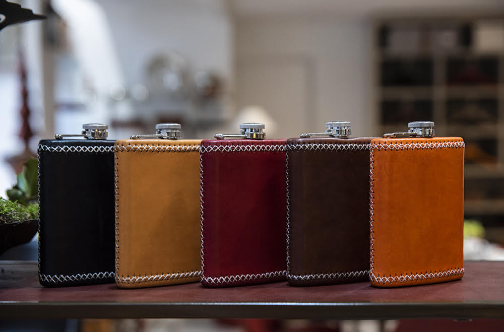 Descripción: Petaca de acero inoxidable forrada en cuero. Disponible en cuero natural, marrón, negro, rojo y naranja.