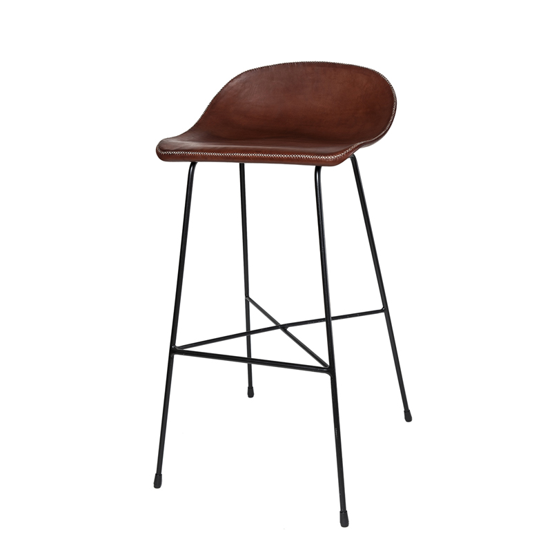 Description: Stool with iron frame and seat covered in leather. Available in natural, brown, black, red and orange leather.