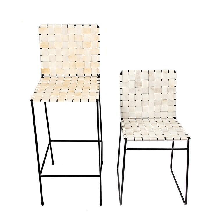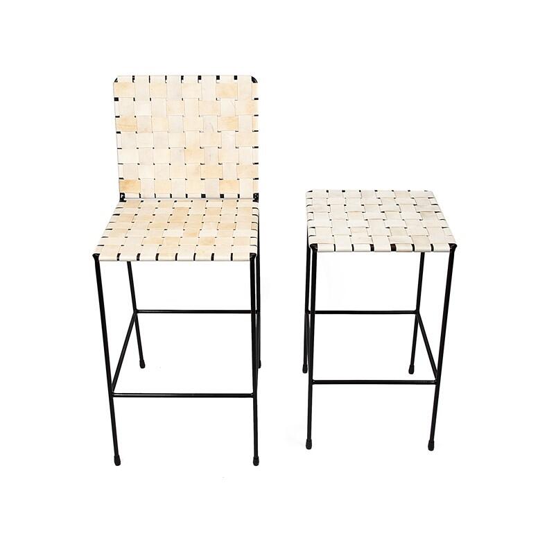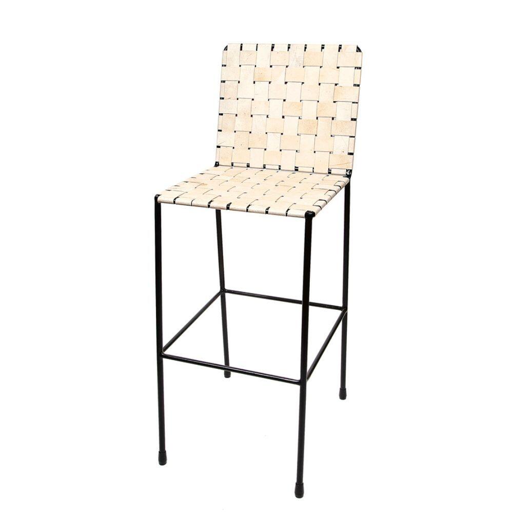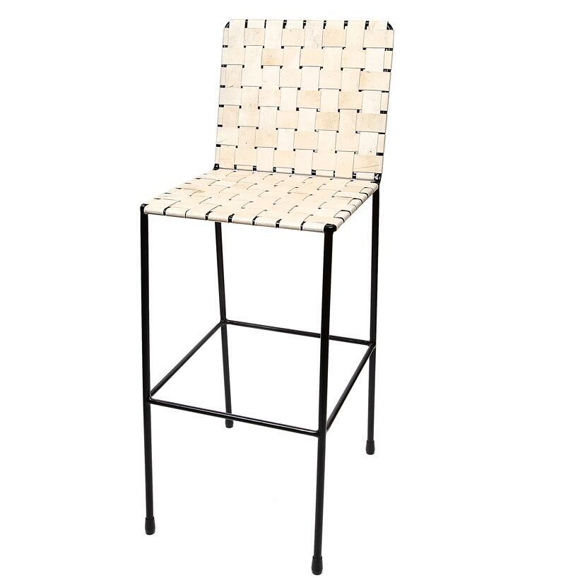Description: Stool with iron base, seat and backrest in woven leather. Available in natural, brown, black, red, orange and new Off-white raw leather. Also available Woven stool (PN9091F) and New Woven Chair (PN9091S)