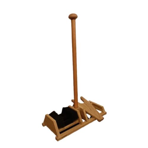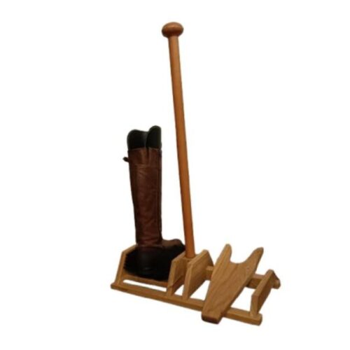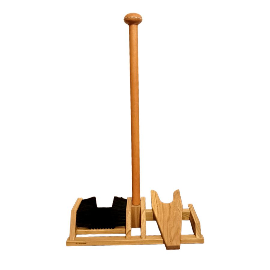 Wooden boot jack with a leather-covered vertical balance handle and a boot cleaning brush. Available in natural, brown, black, red and orange leather.